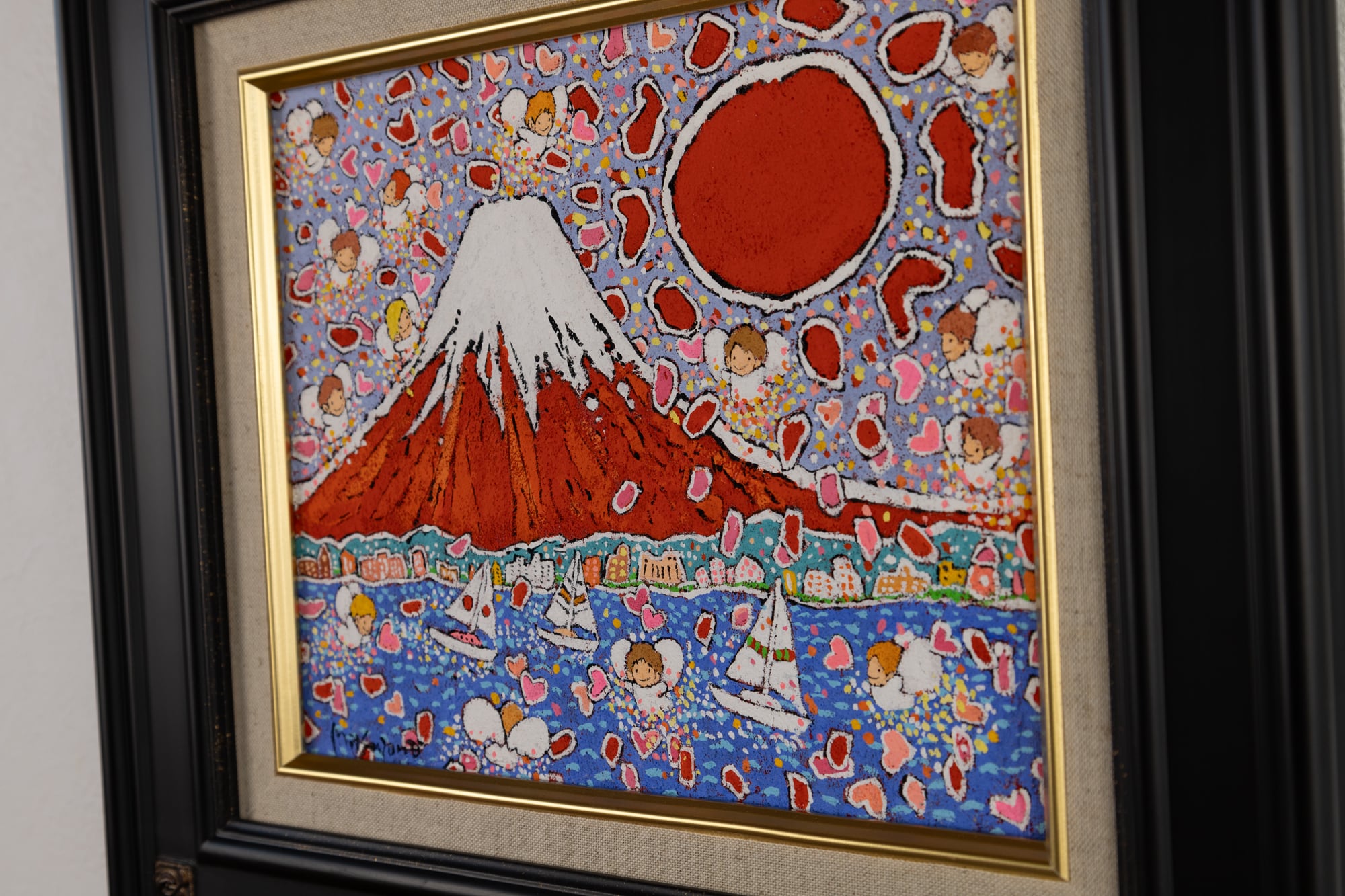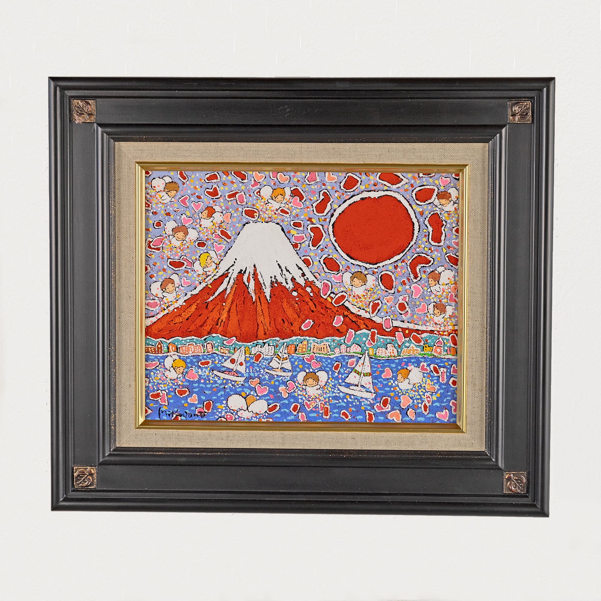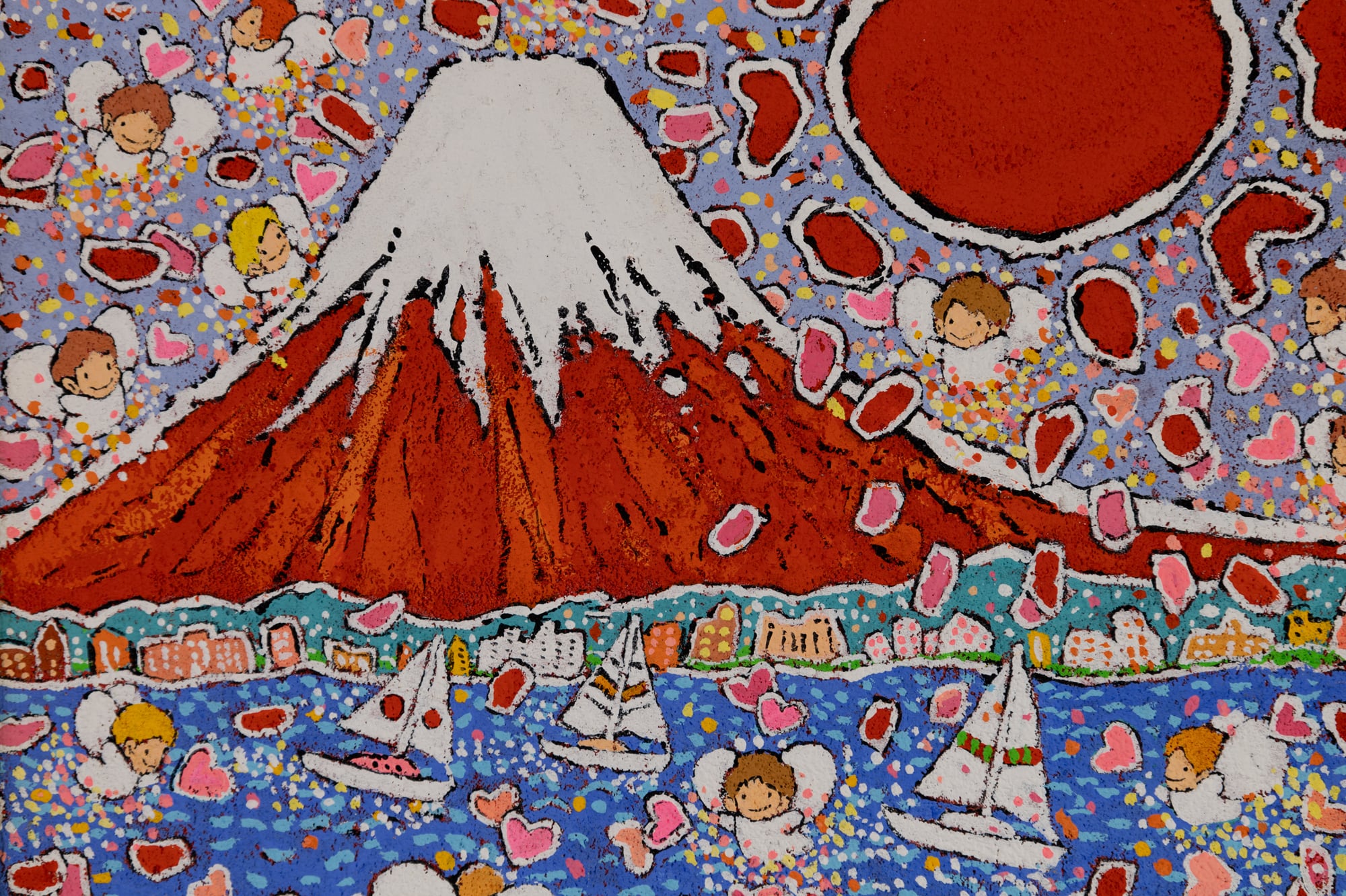 富士山・太陽・天使という三つの神聖な象徴を一つの画面に描いた作品です。