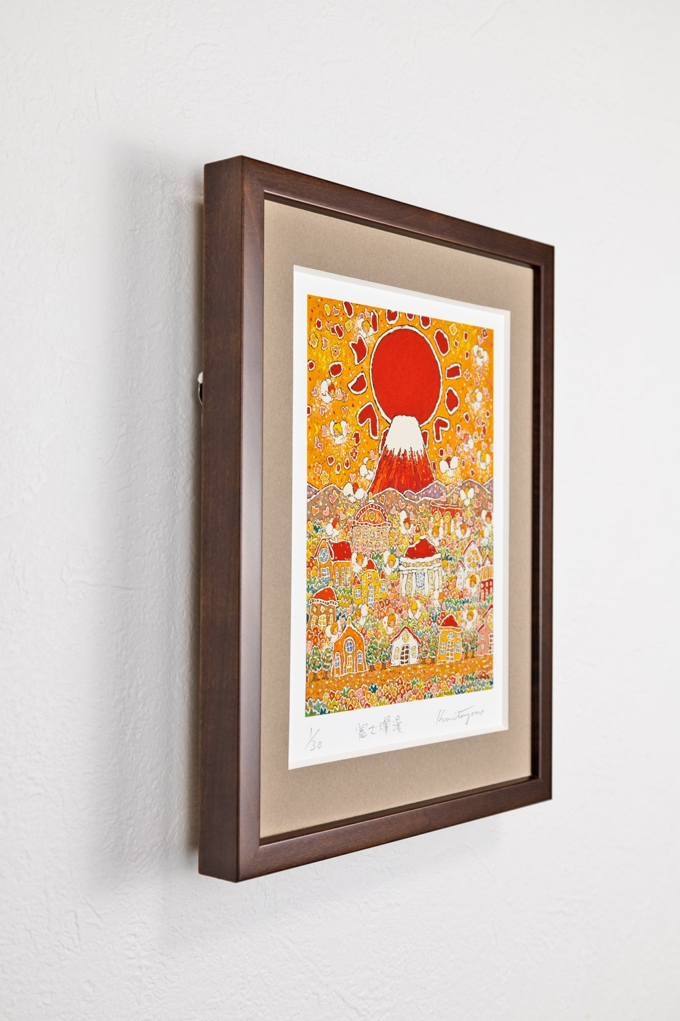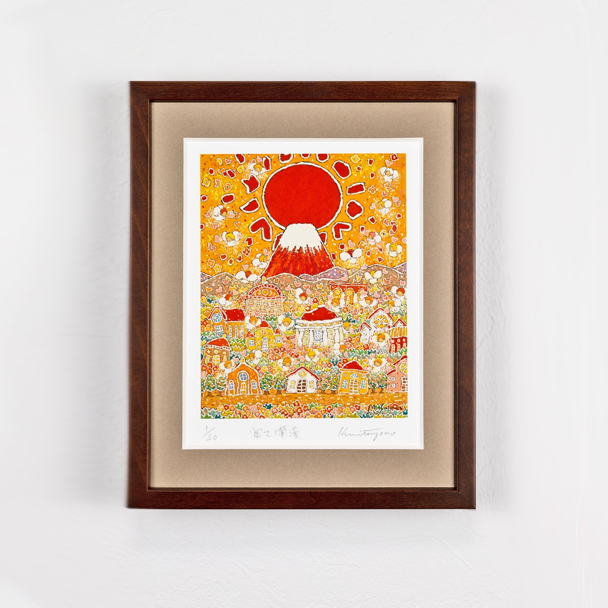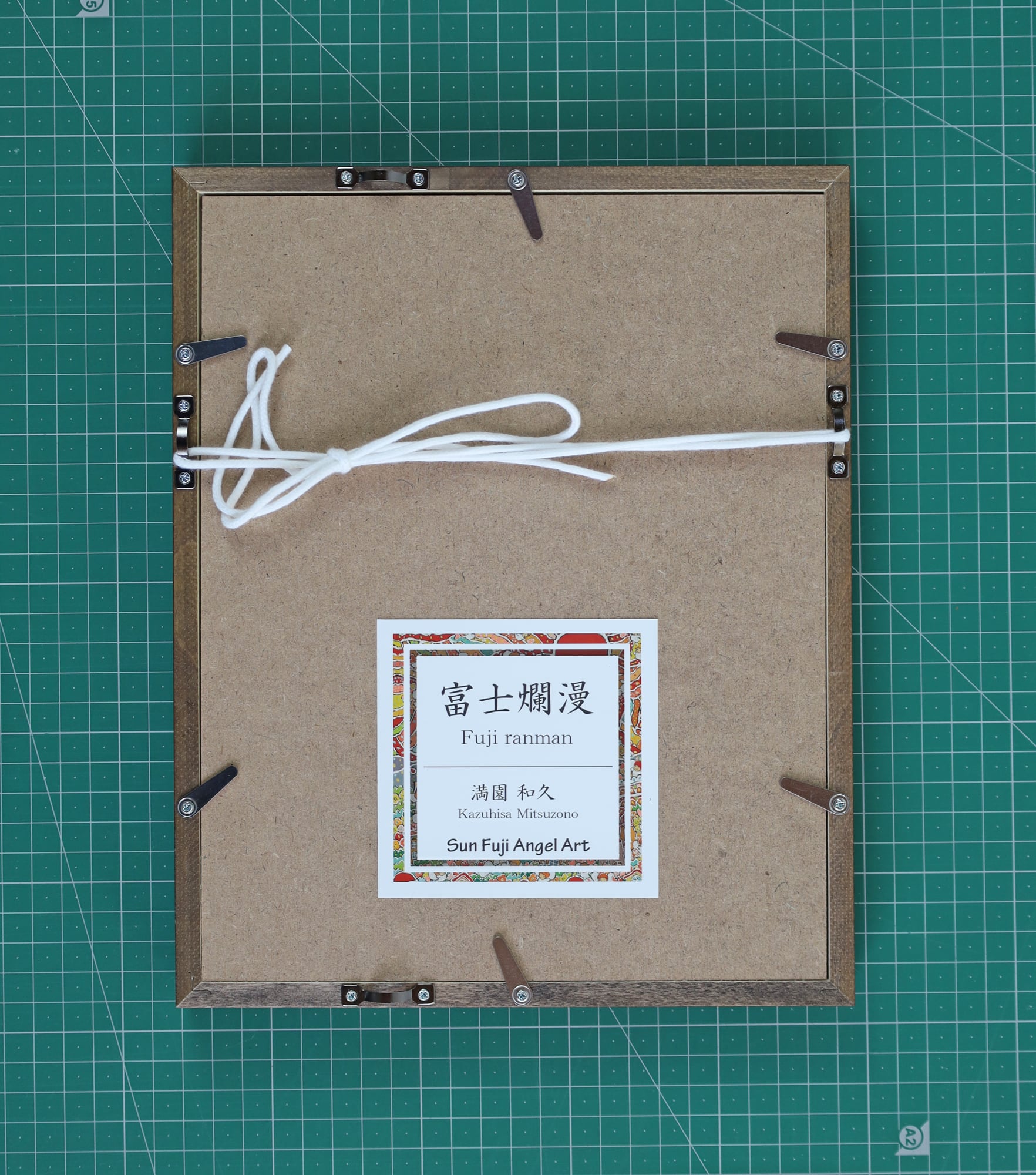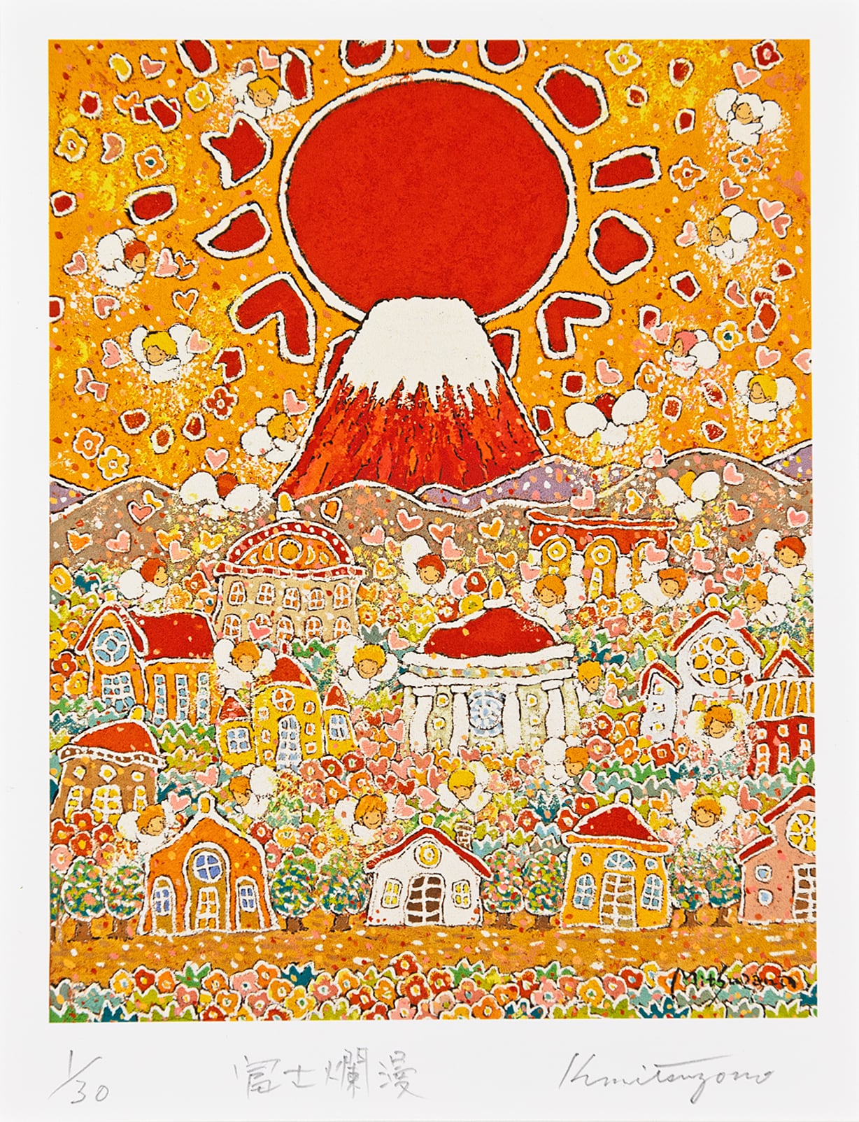 本作品「富士爛漫」は、富士山・太陽・花・天使という象徴的なモチーフを組み合わせた作品です。