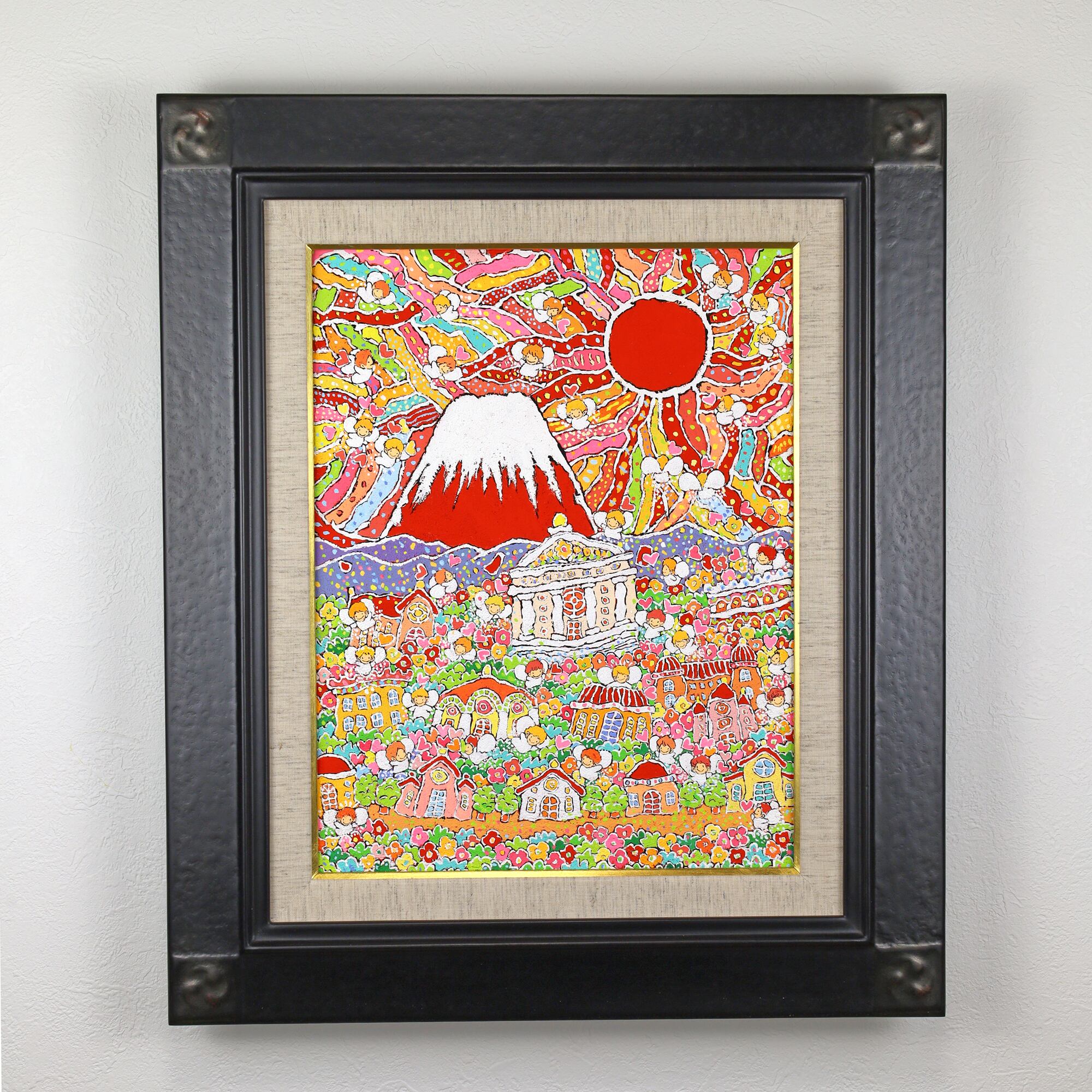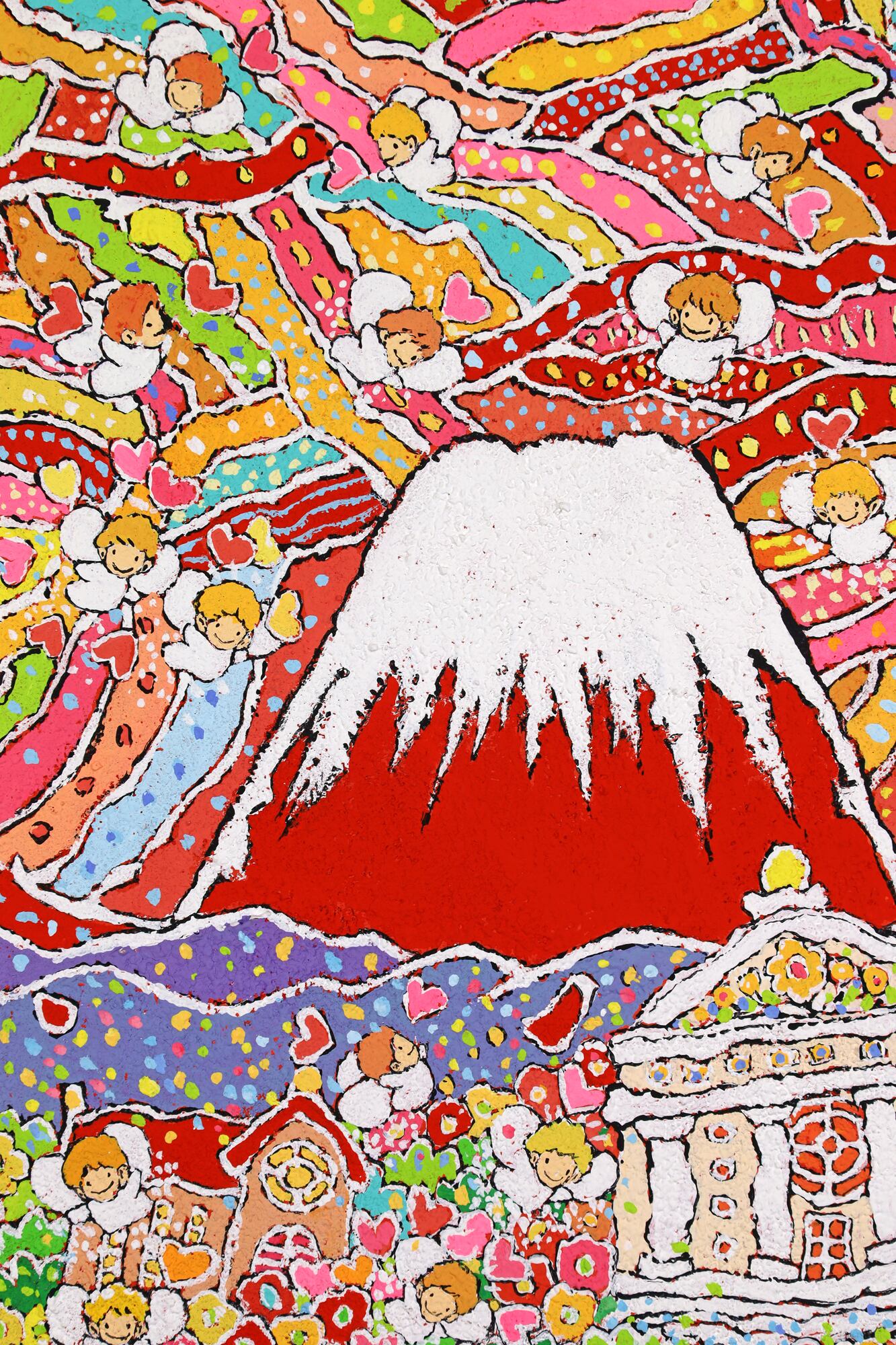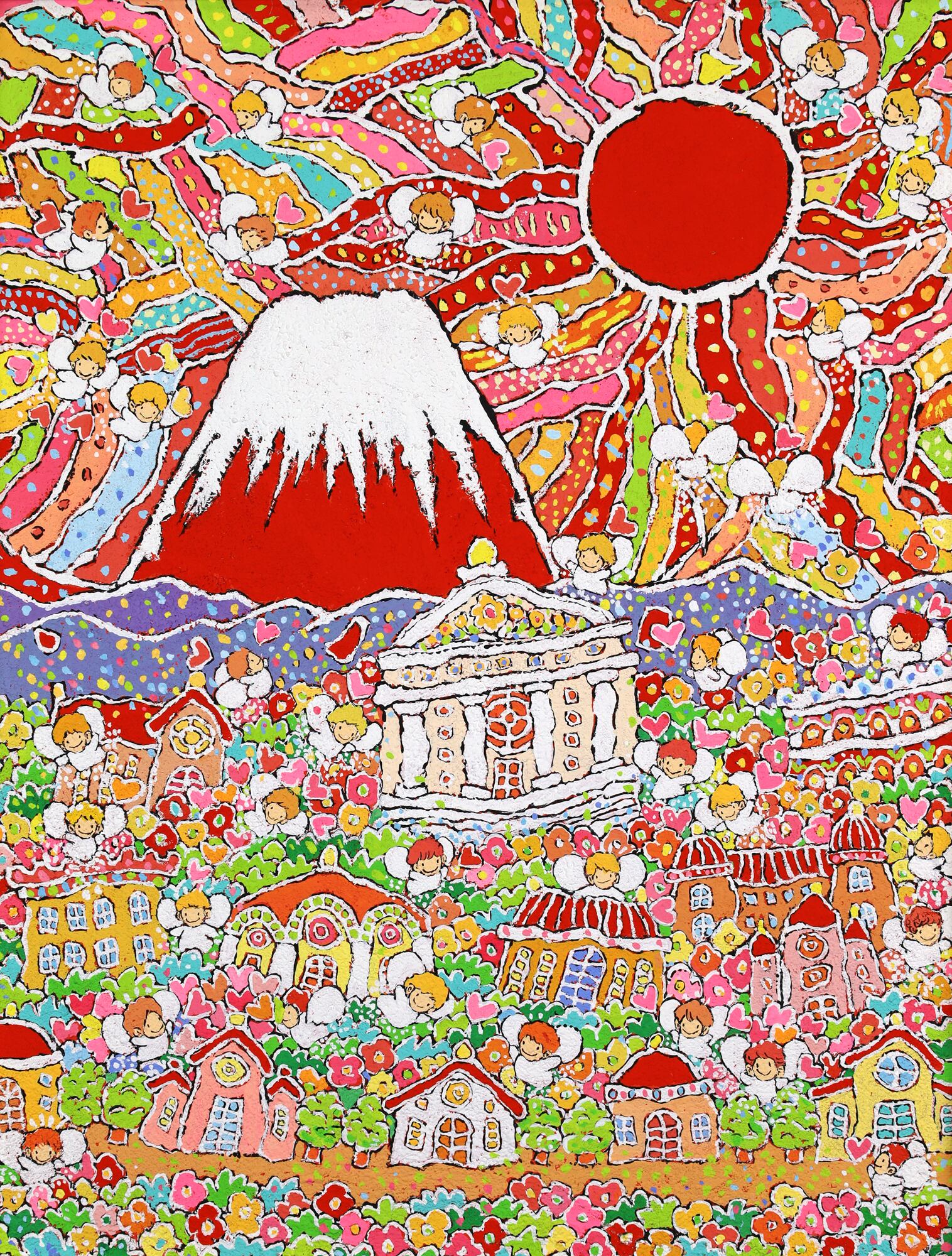 本作品は、富士山のふもとで、太陽の光を浴びながら花々と天使が咲き誇る、生命の喜びを表現した作品です。