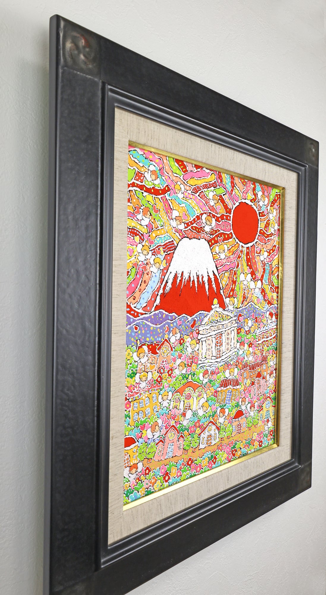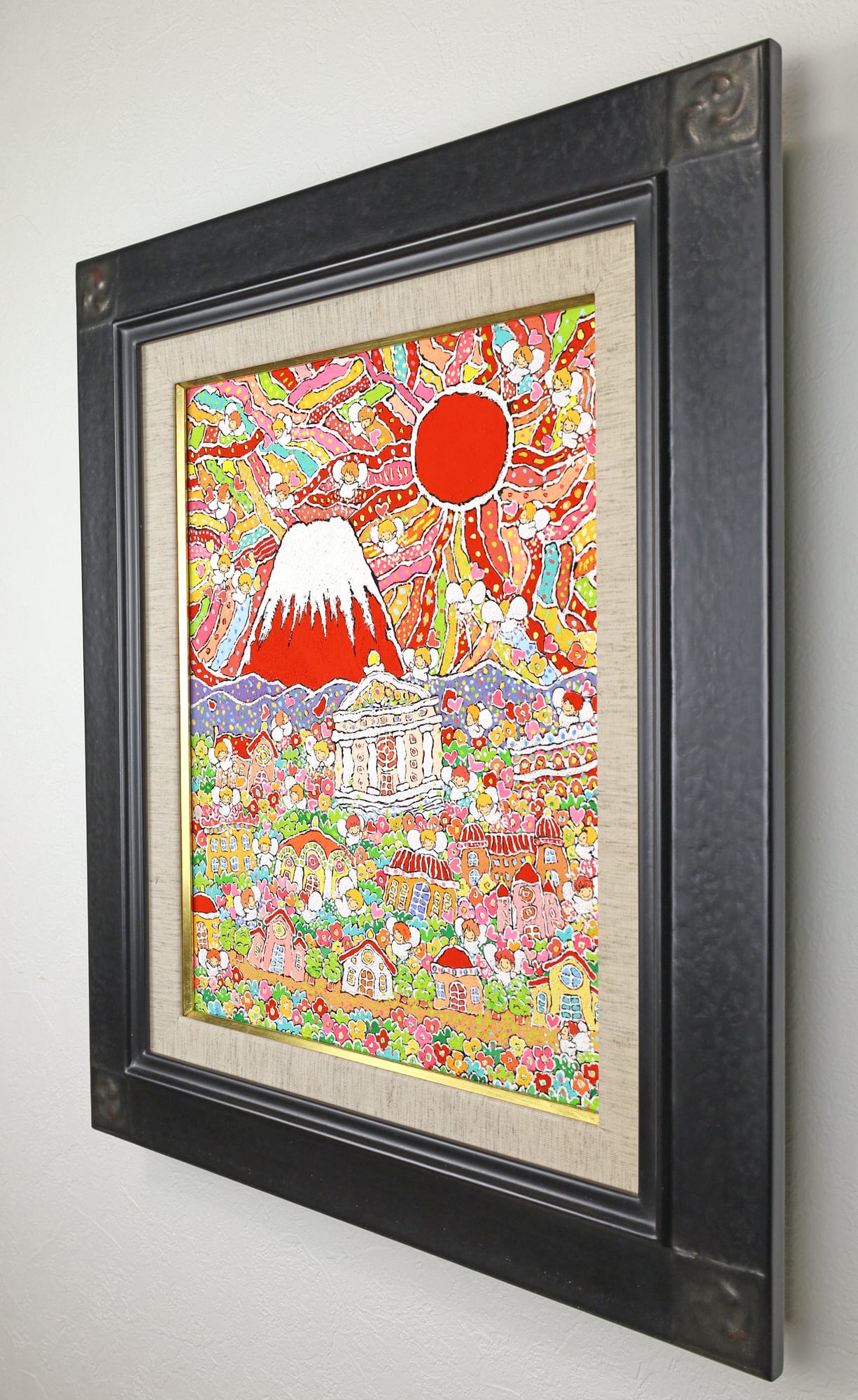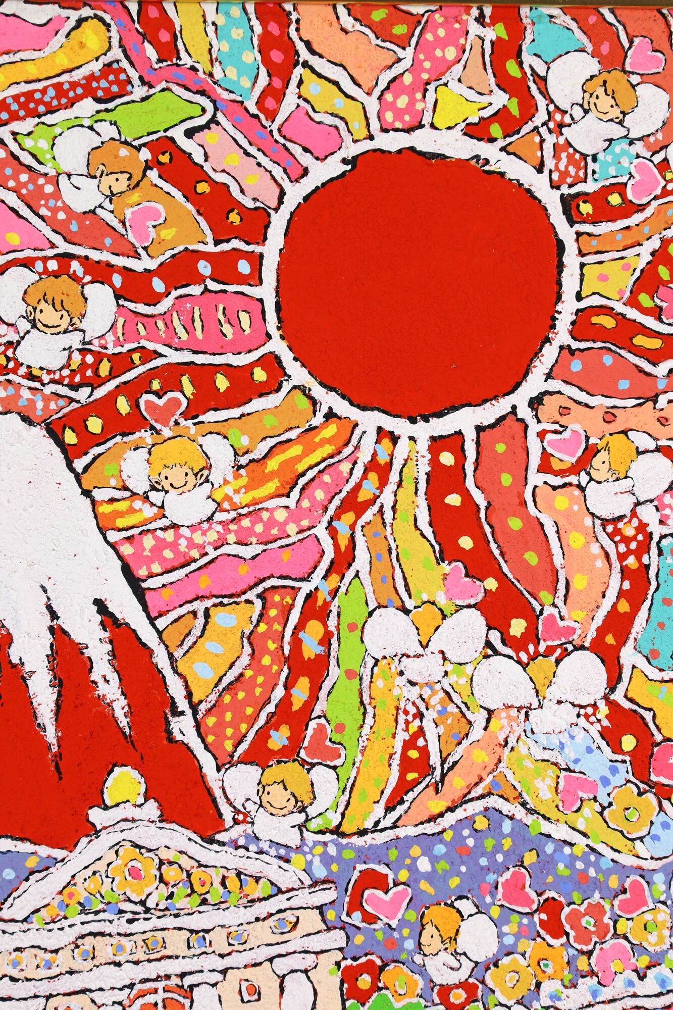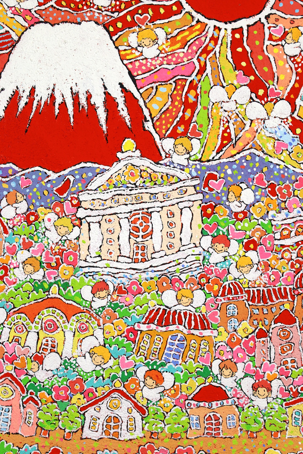 本作品は、富士山のふもとで、太陽の光を浴びながら花々と天使が咲き誇る、生命の喜びを表現した作品です。