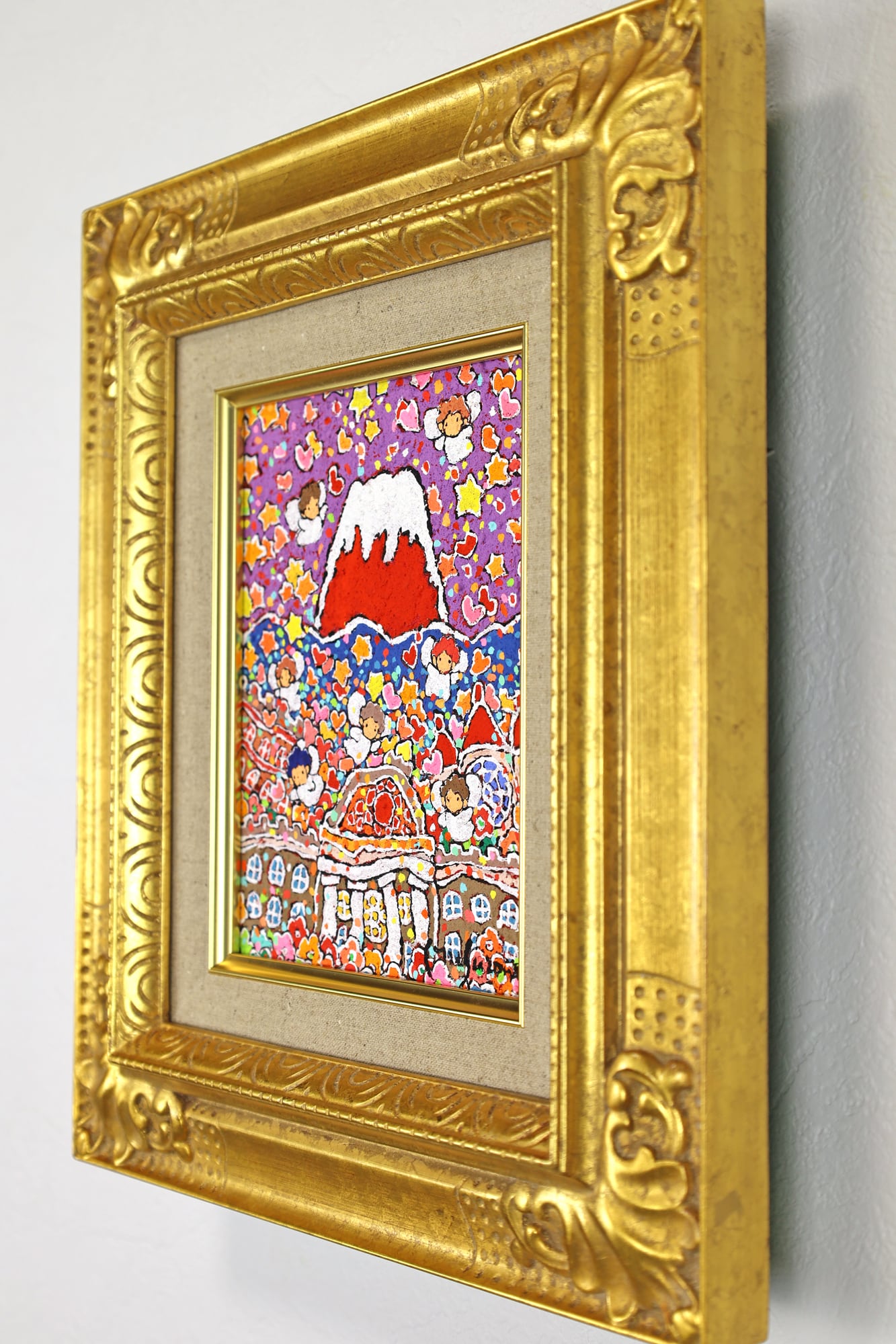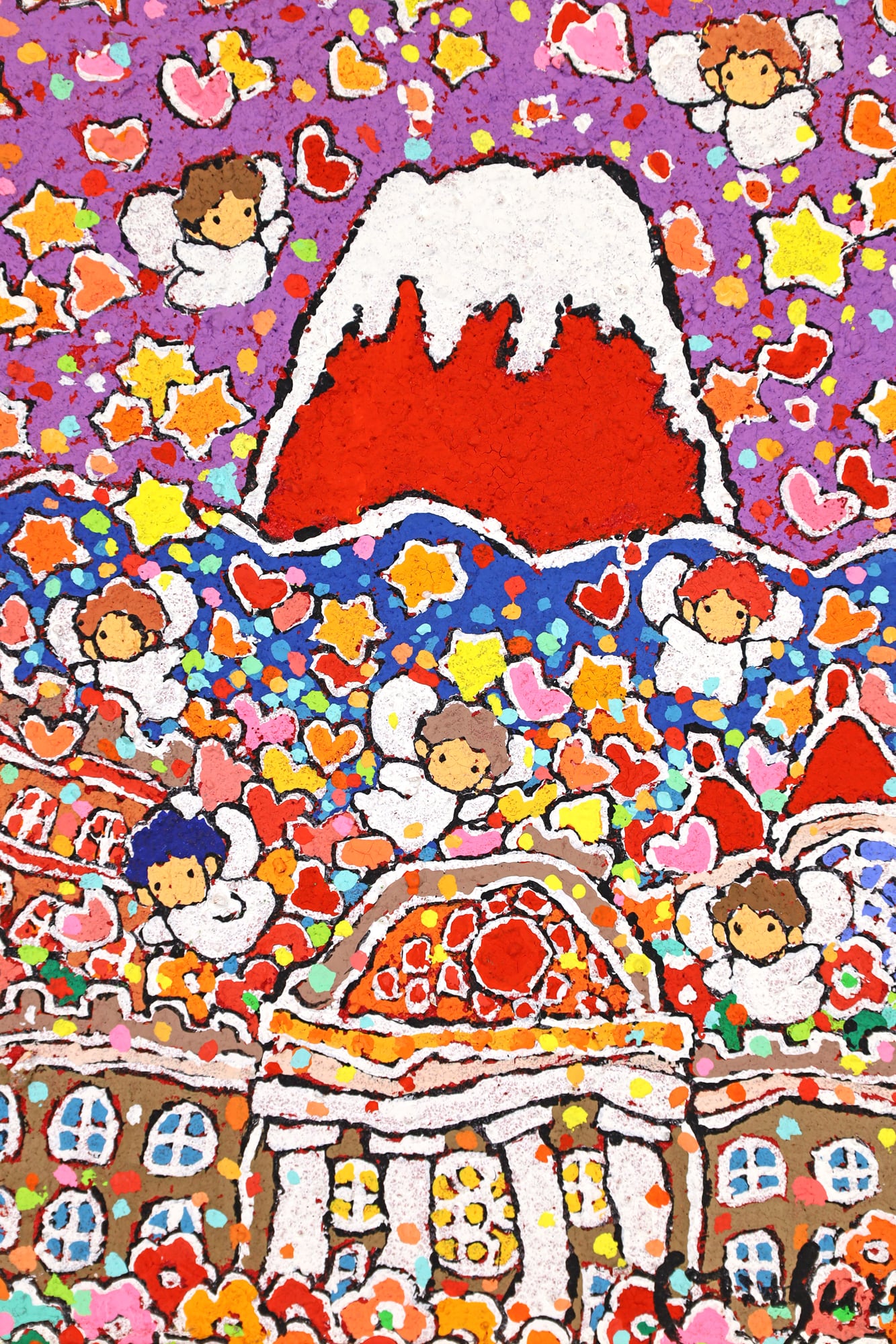 本作品は、富士山のふもとで、太陽の光を浴びながら花々と天使が咲き誇る、生命の喜びを表現した作品です。